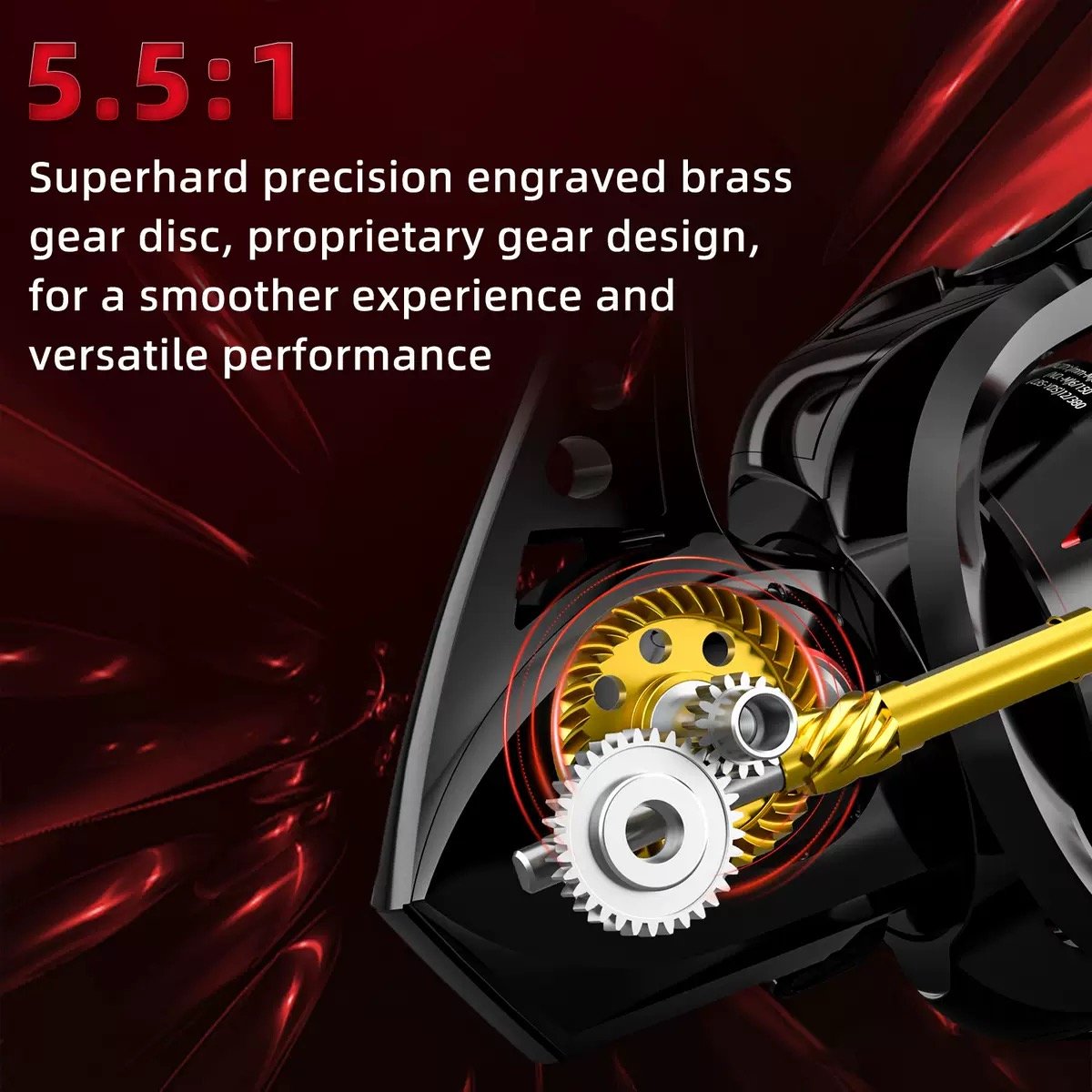 Equipped with superhard precision-engraved brass gear discs and a proprietary gear design (5.2:1/5.5:1 ratio), delivering ultra-smooth reeling and versatile performance for various fishing styles.