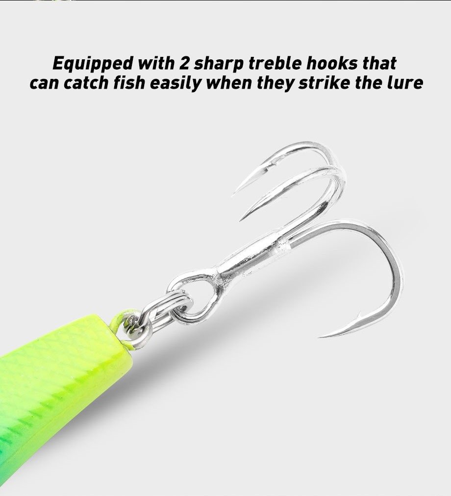 3. Comes with 2 sharp high-carbon steel treble hooks, featuring high strength and excellent puncture performance, effectively reducing fish escape and improving fishing success rate.