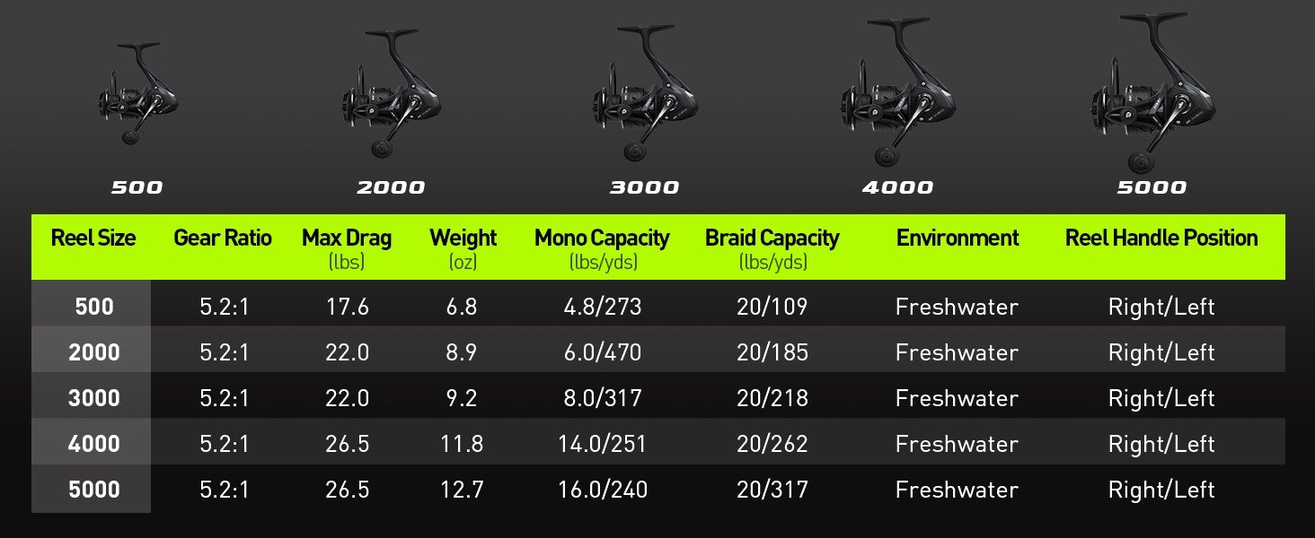 9+1 Ball Bearings, Max Drag 23 Lbs, Gear Ratio 5.2:1, Graphite Frame, CNC Aluminum Spool, 500-5000 Series, Interchangeable Handle
